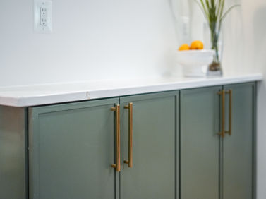 This Arlington, VA kitchen renovation masterfully utilizes a two-tone color palette, pairing custom sage green lower cabinetry with crisp white uppers to create a balanced, nature-inspired aesthetic. We anchored the space with a sleek black soapstone-style island and integrated smart storage solutions, including custom pull-out pantry drawers and gold hardware accents. The result is a highly functional, contemporary condo kitchen that feels both expansive and sophisticated.